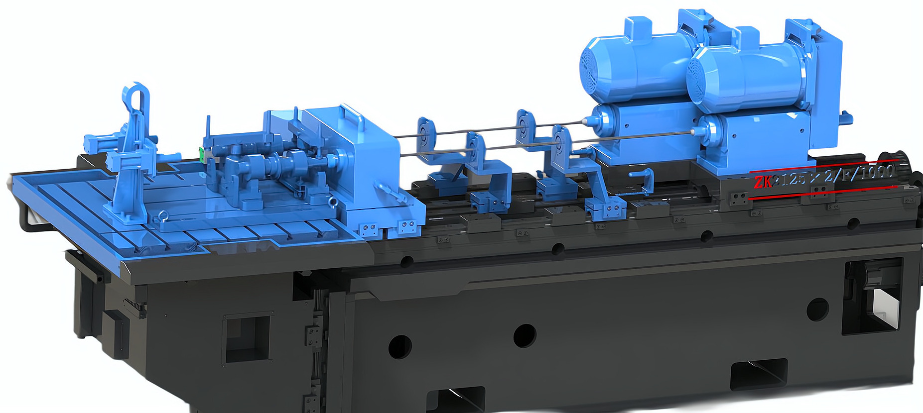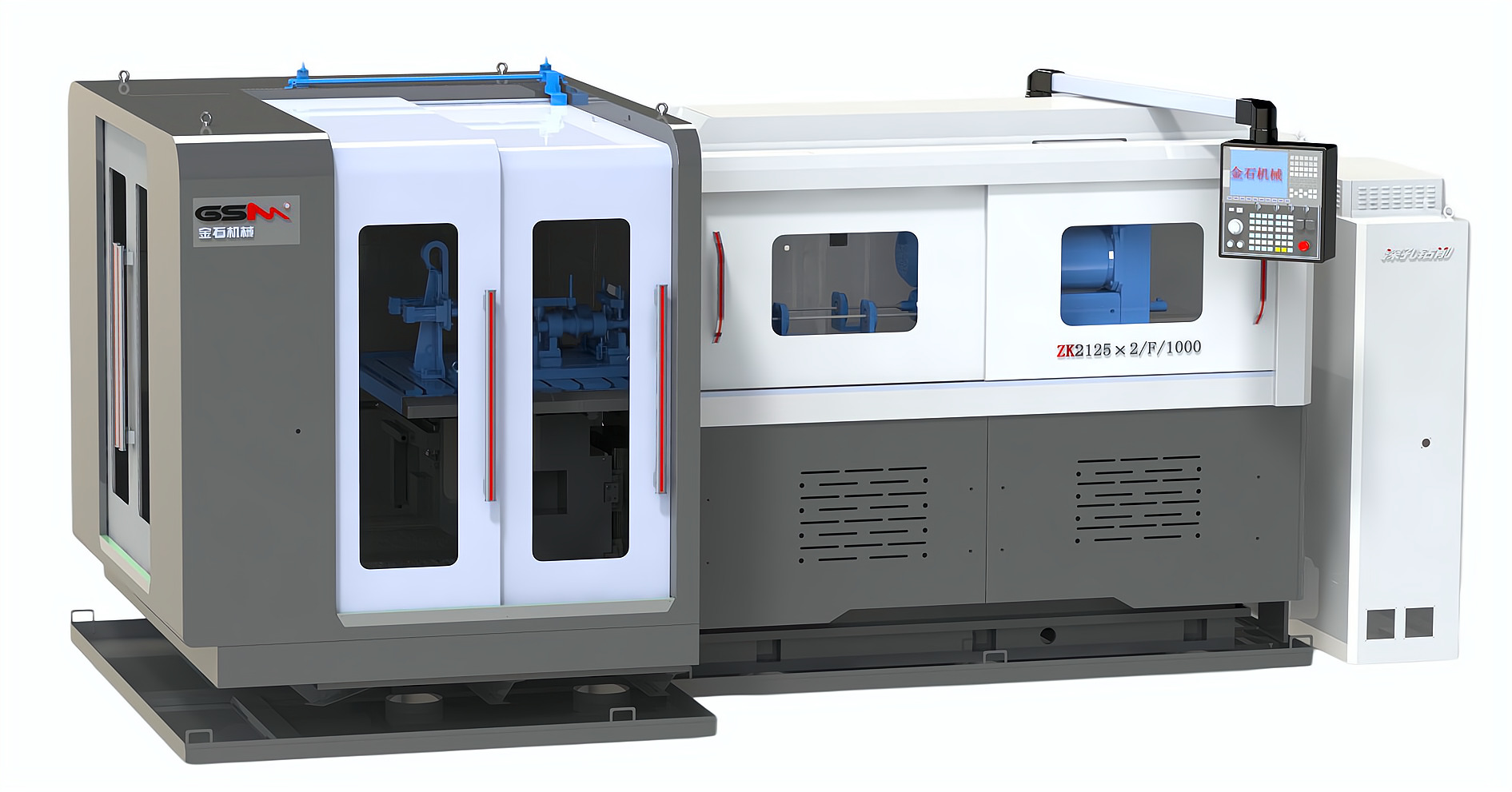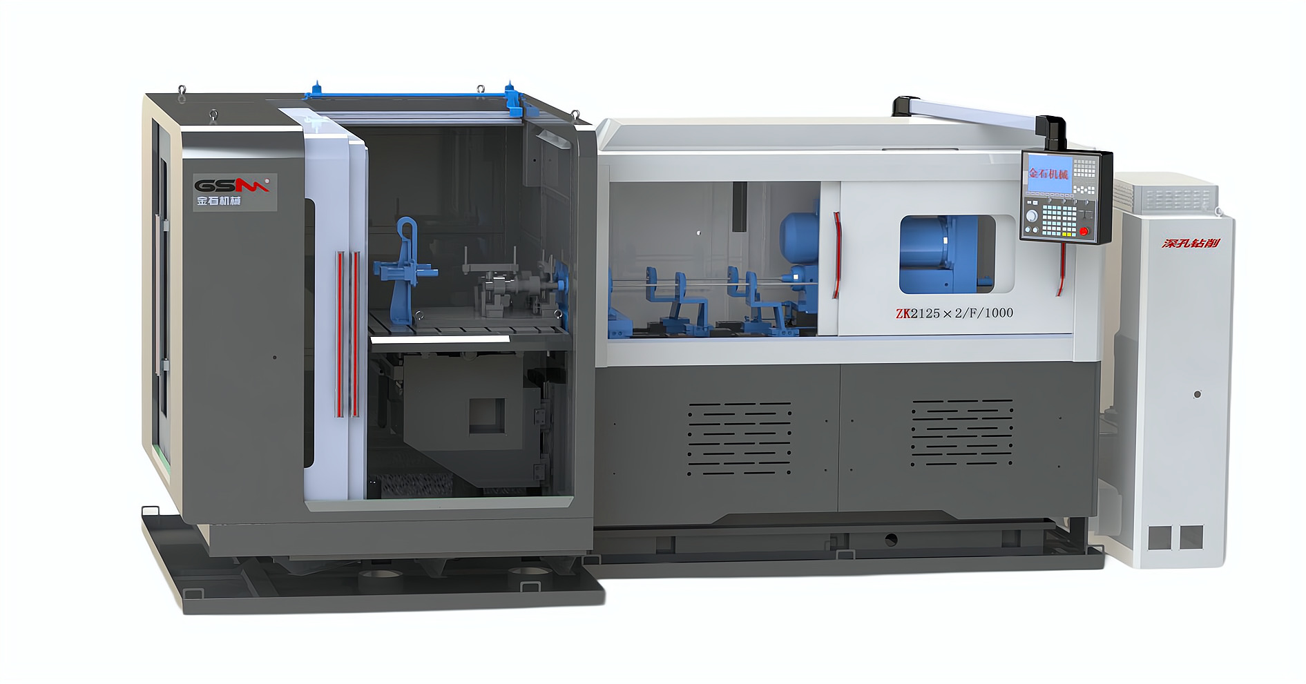 簡要說明:機床主機分為左右兩體。左體為升降+水平移動工作臺。右體為鉆桿床身、鉆桿主軸箱、導向排屑箱、鉆桿進給系統。左右兩體共同安裝在高強度底座上。高壓冷卻系統與機床主機平行放置。整體結構緊湊,占地面積小。操作方便。