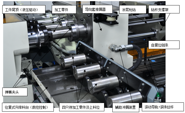 機床具備四主軸、八工位設計,工件采用彈簧夾頭通過零件外圓自動定位夾緊。機床配置伺服驅動數控控制的自動往復升降式上料臺,其料臺的數控橫移、升降以及固定的上下料區域設計,均可使機床以極好的適應性匹配適宜的如桁架機械手或六軸機器人或功能氣缸等自動化形式,槍鉆工序的整個加工過程則在數控方式下實現了完全的自動化加工。